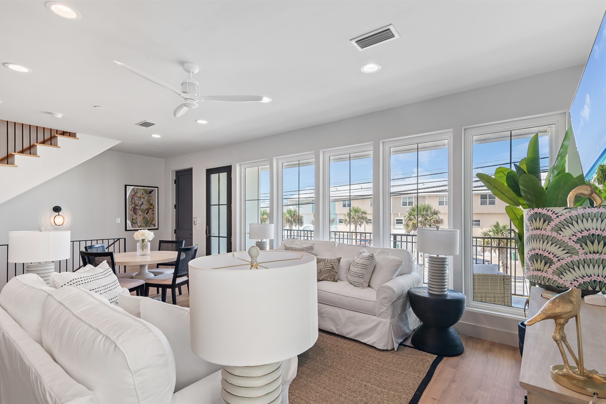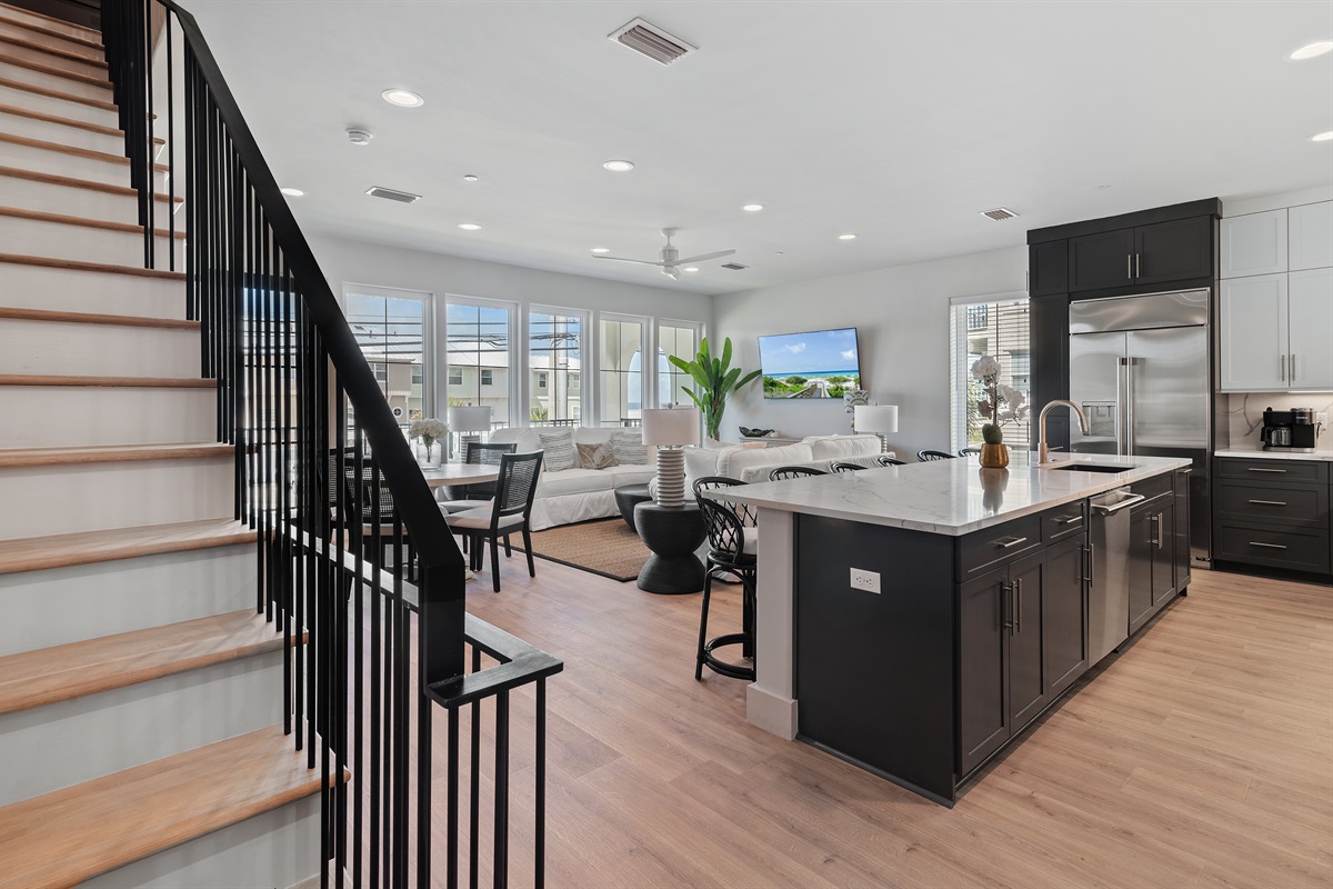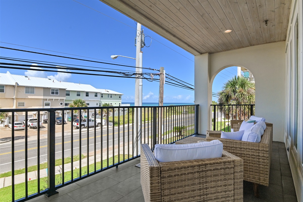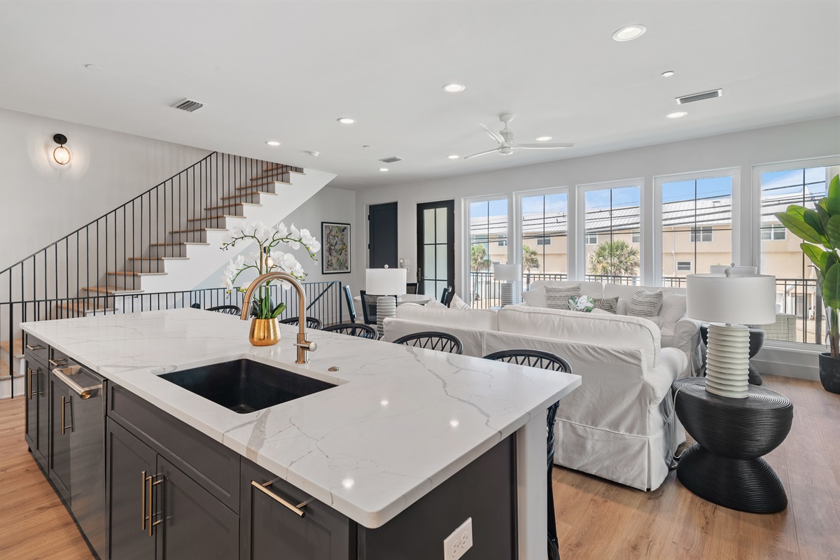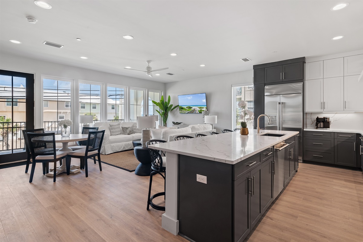 2nd Floor: Kitchen, living room, dining room, and a large balcony overlooking the south side of Front Beach Road. To the West, you can see the Gulf of Mexico and the sugary white sand beaches. The first king suite is located just off the kitchen featuring a king-sized bed, en-suite bathroom with a large walk in shower, and double vanity sink.