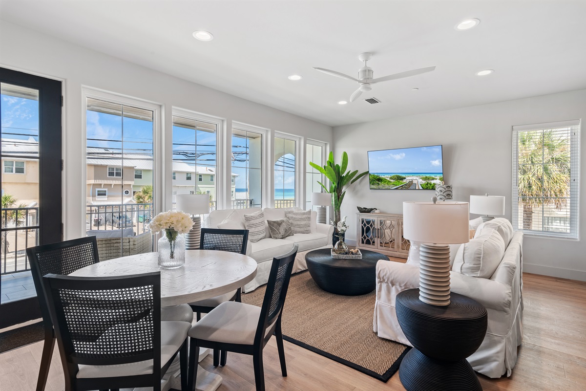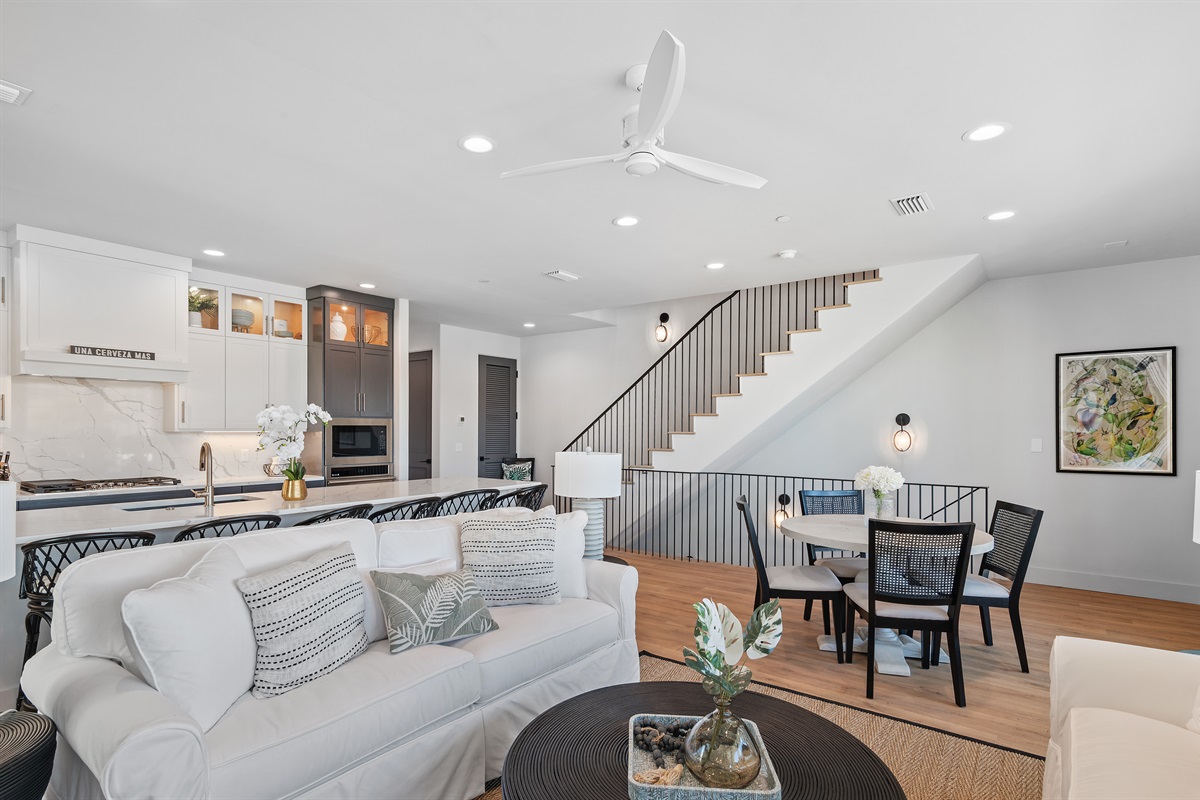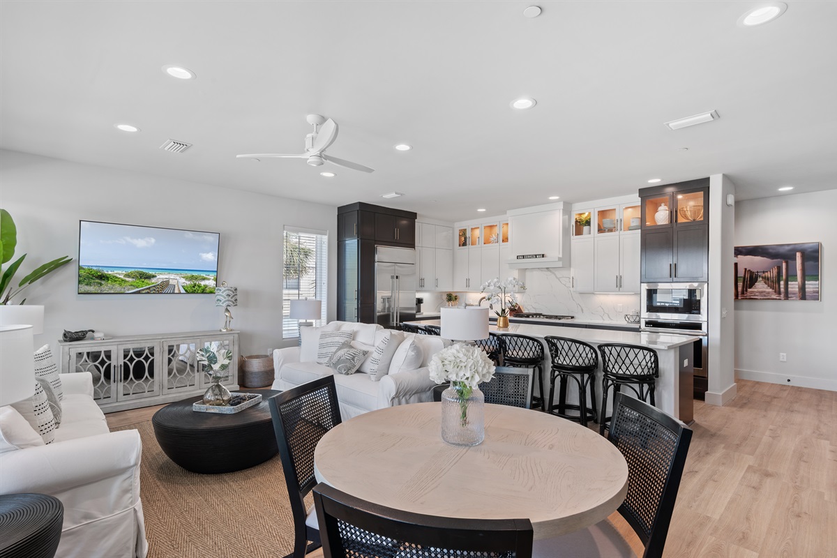 Living Area: Step into a spacious and elegantly decorated living room with comfortable seating, a large flat-screen TV, and plenty of natural light. The open floor plan seamlessly connects the living area to the dining space and kitchen, creating an ideal environment for family gatherings and entertaining.