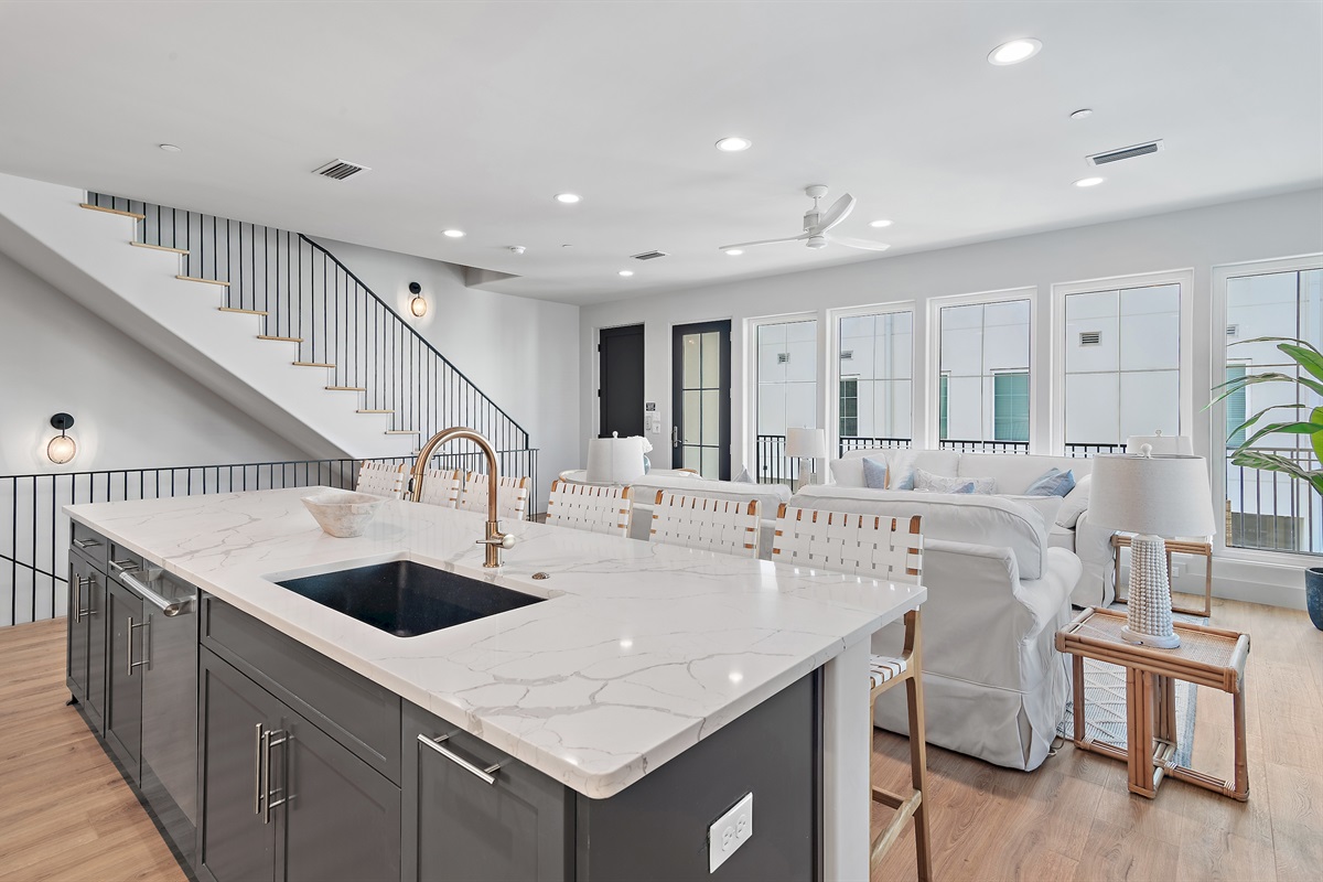 2nd Floor: Kitchen, living room, dining room, and a large balcony overlooking the center of the complex driveway. The first king suite is located just off the kitchen featuring a king-sized bed, en-suite bathroom with a large walk in shower, and double vanity sink.
