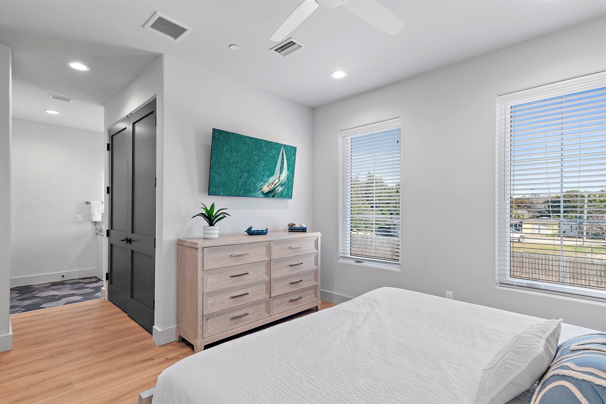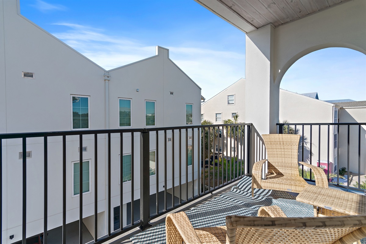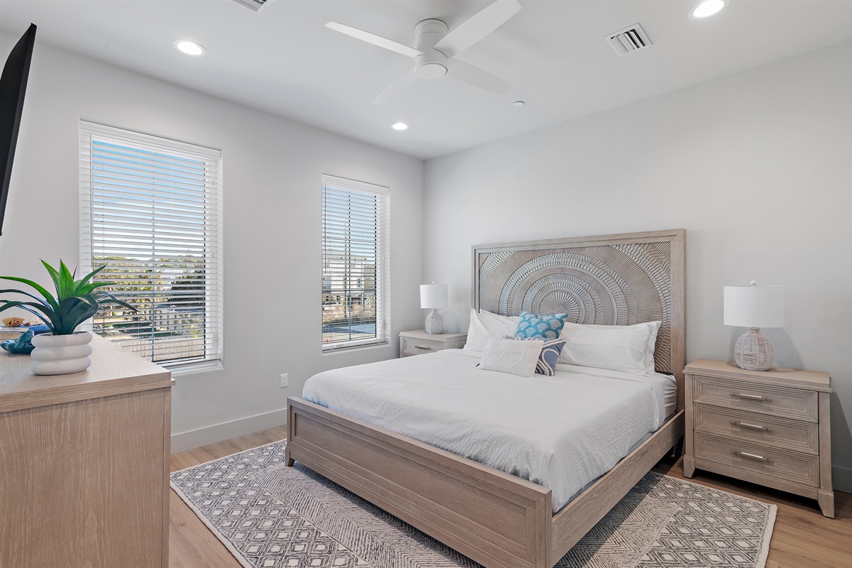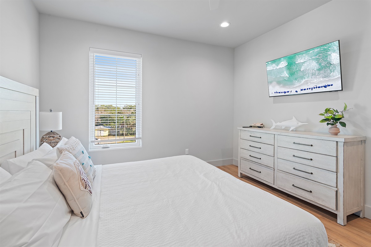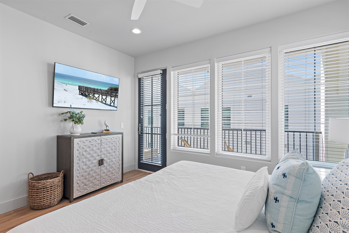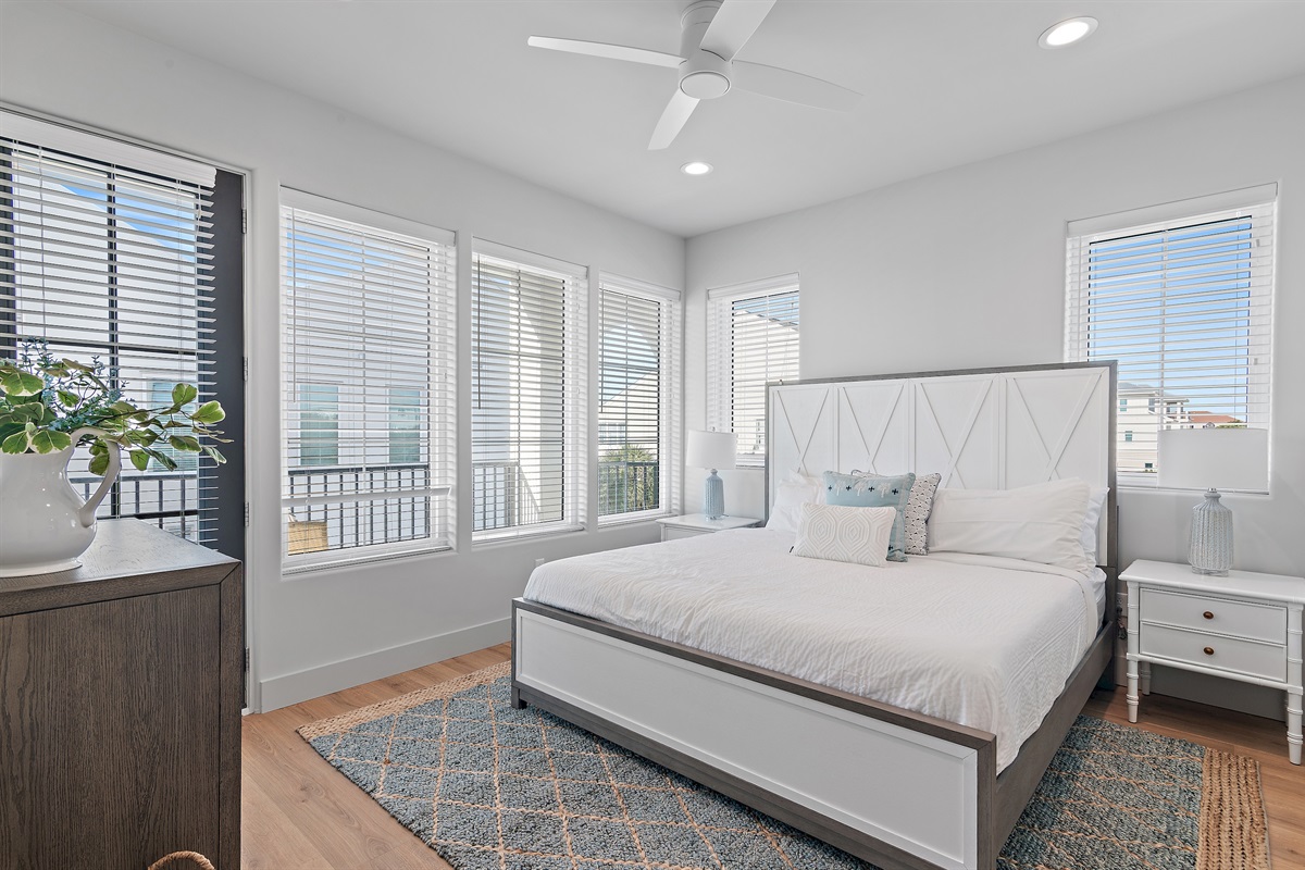 3rd Floor: The master suite has it’s own private balcony with views of the center of the complex driveway. Guests will love the king sized bed, ample closet space, and tasteful coastal décor. This bedroom has it’s own en-suite bathroom with a walk in shower and double sink vanity.