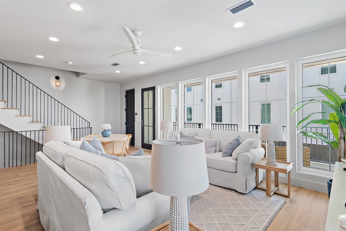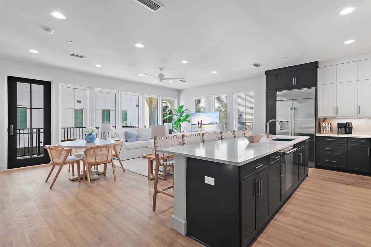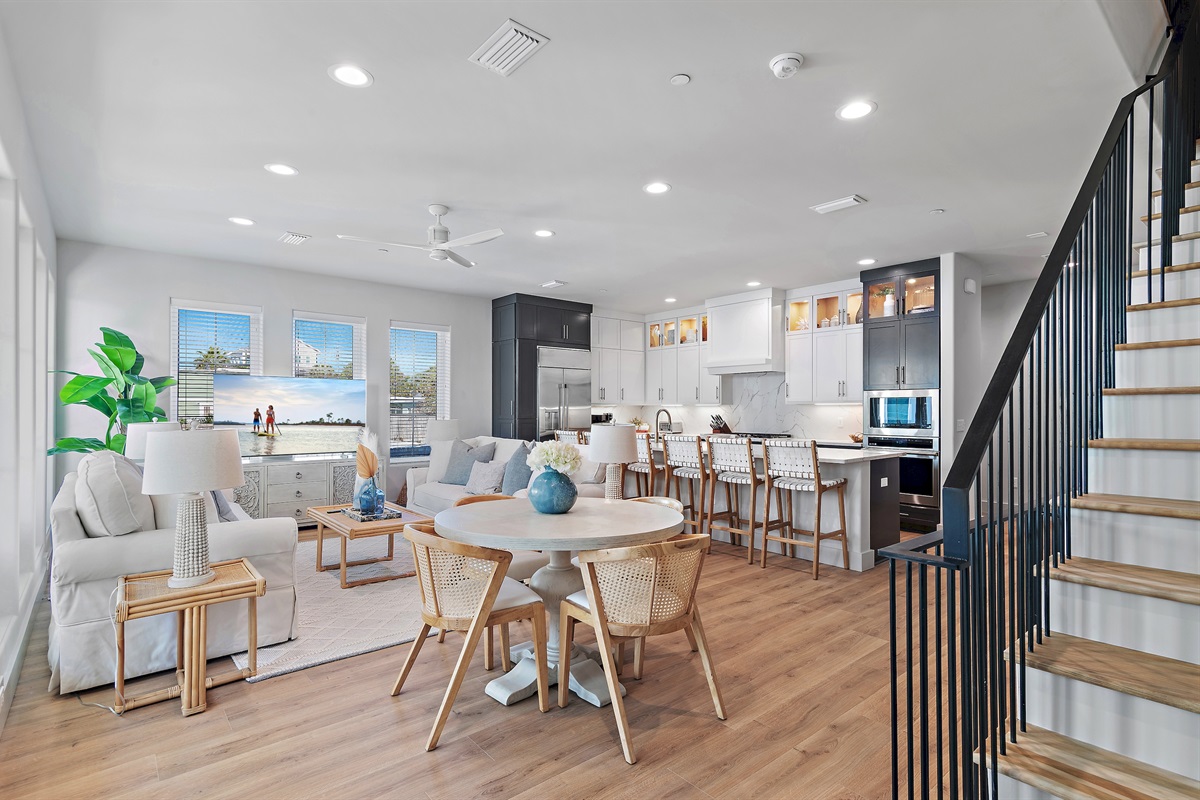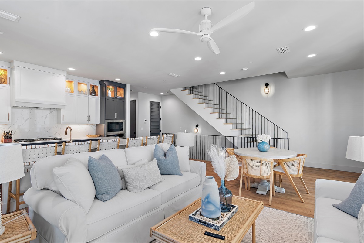 Living Area: Step into a spacious and elegantly decorated living room with comfortable seating, a large flat-screen TV, and plenty of natural light. The open floor plan seamlessly connects the living area to the dining space and kitchen, creating an ideal environment for family gatherings and entertaining.