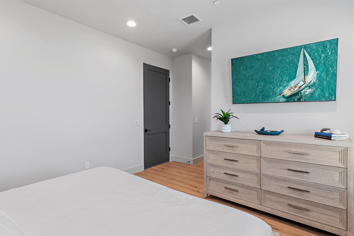 Guest Bedroom 2 includes a king sized bed, an en-suite bathroom with a walk in shower.