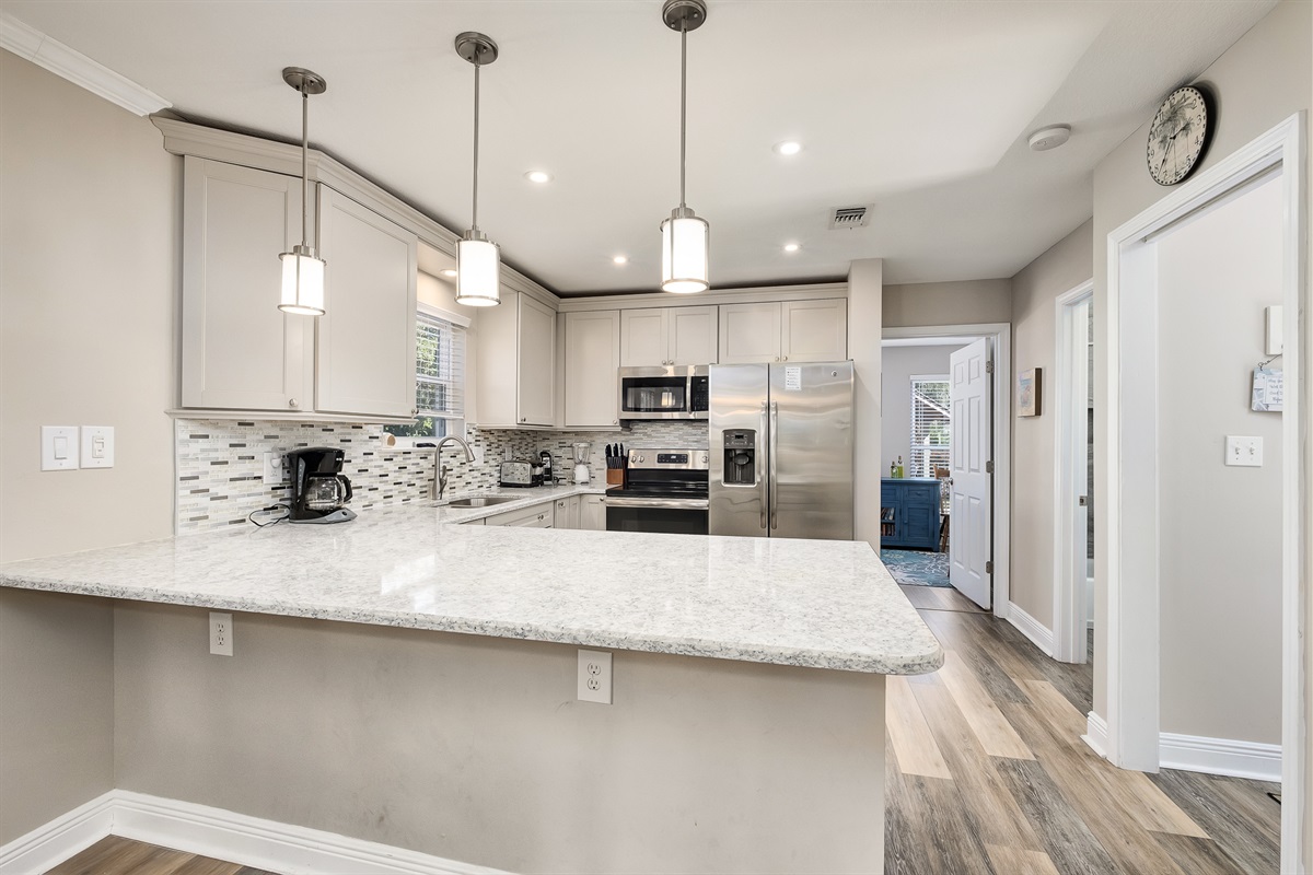 Kitchen: Recently renovated with stainless steel appliances, granite counters, and a custom coffee bar