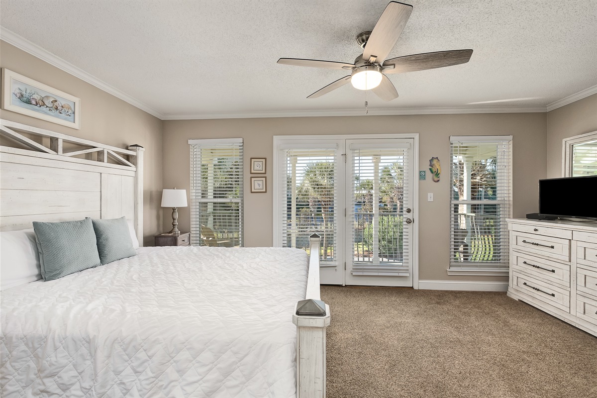 Master Suite: King bed, attached bathroom, and private balcony