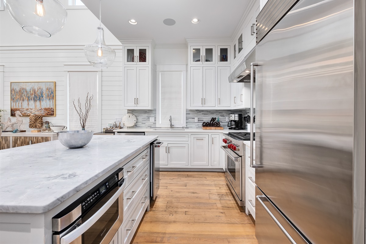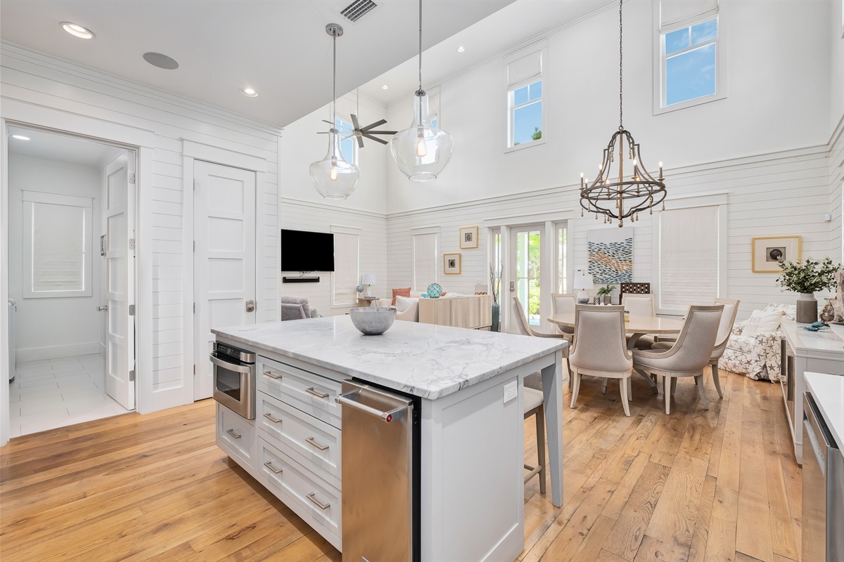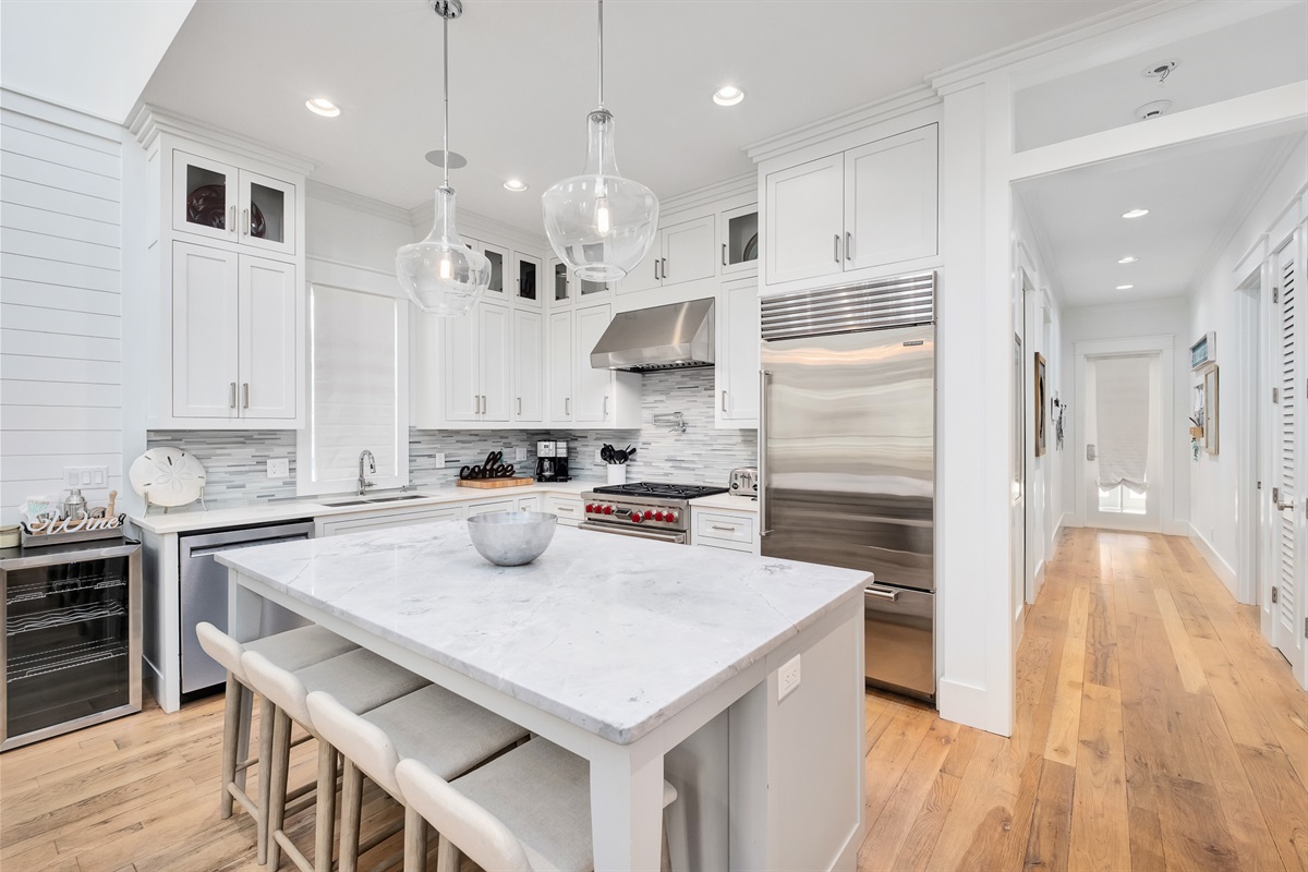 Kitchen: Stainless steel appliances, custom tile backsplash, marble countertops, island with bar stools for 3, family table with seating for 8