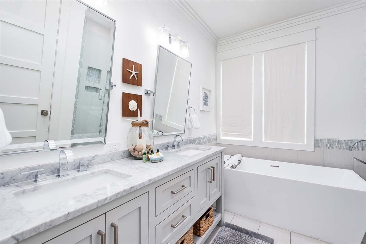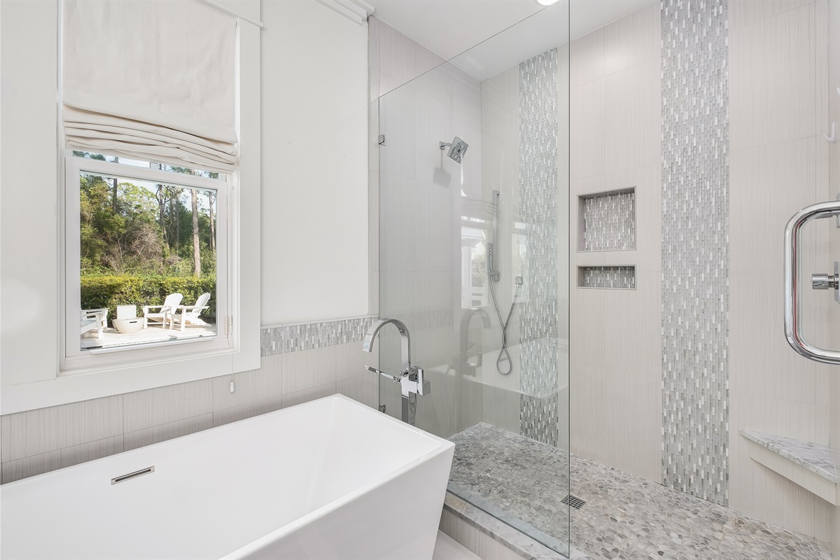 Second Guest Bedroom: King bed, pool views, private ensuite bathroom with single vanity and shower