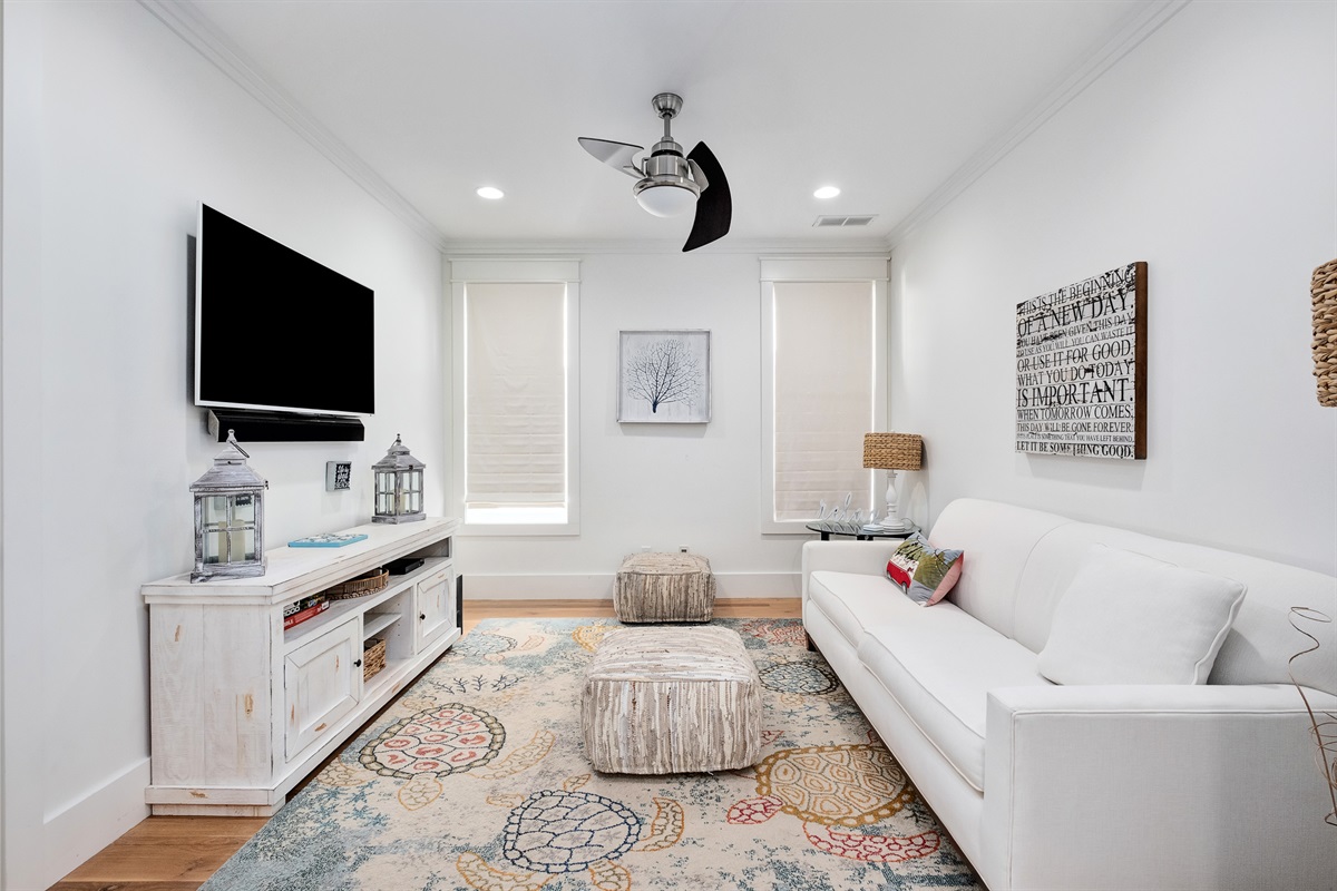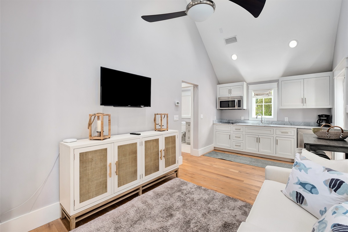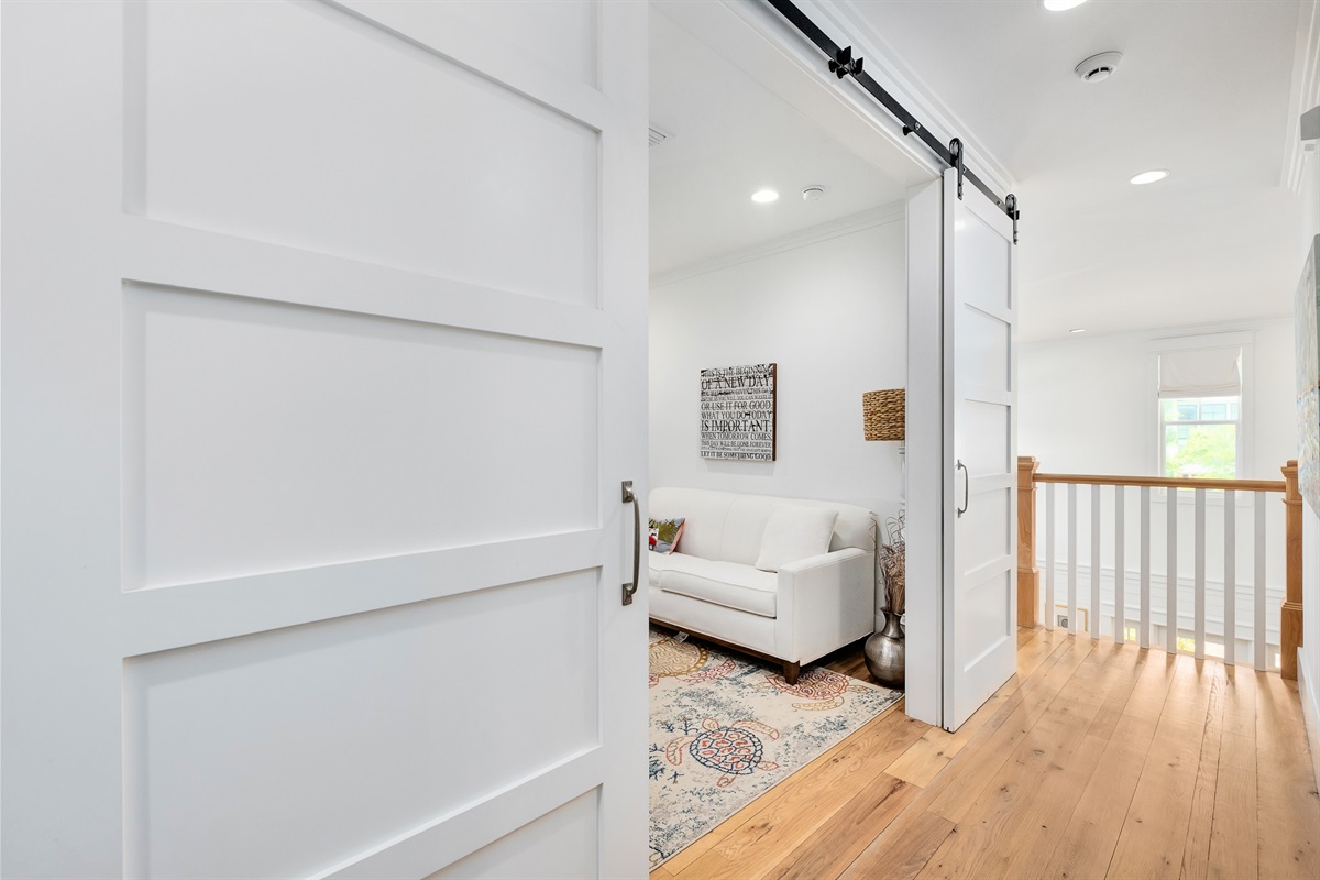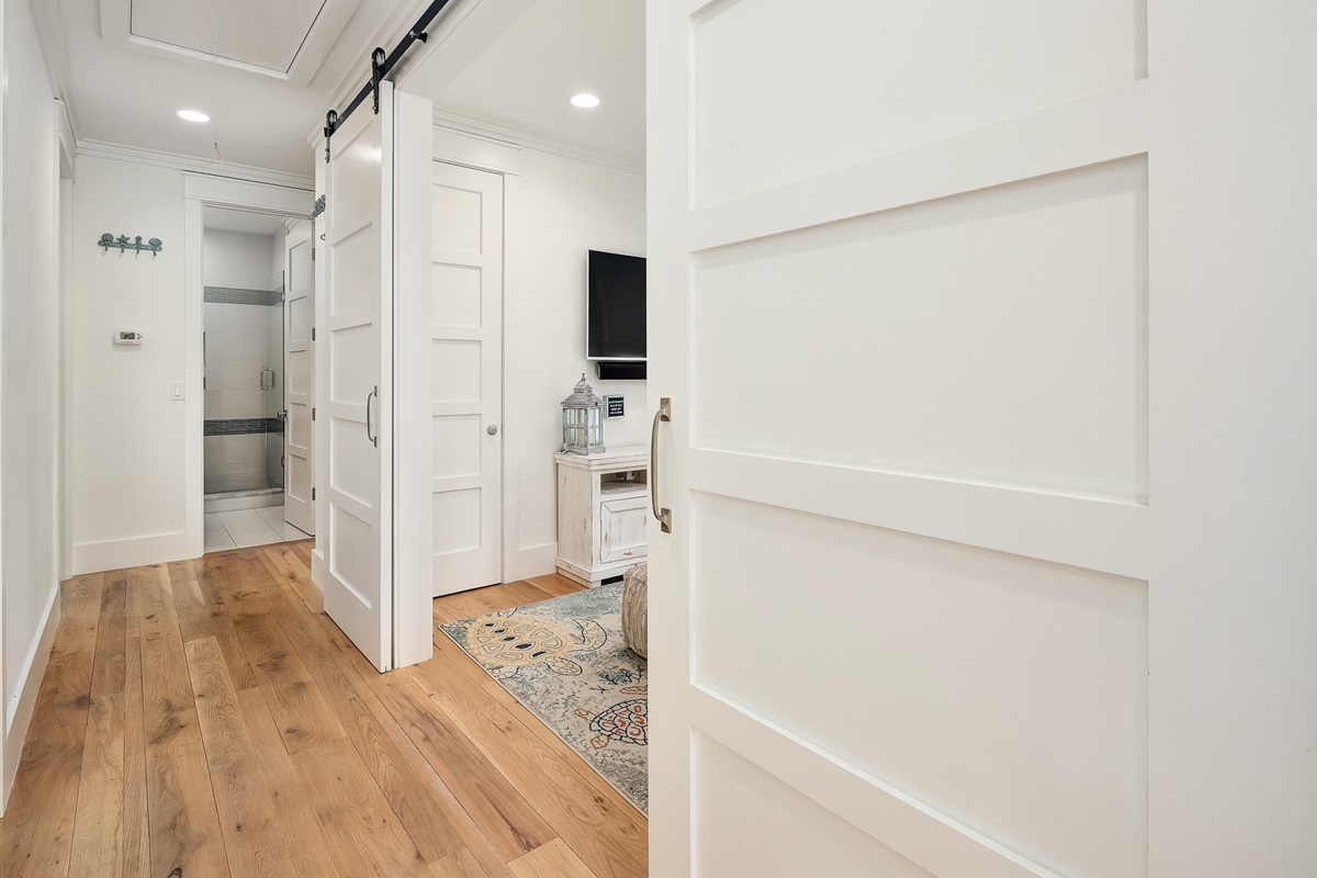 Den Area: Sleeper sofa, TV, sliding barn doors for privacy