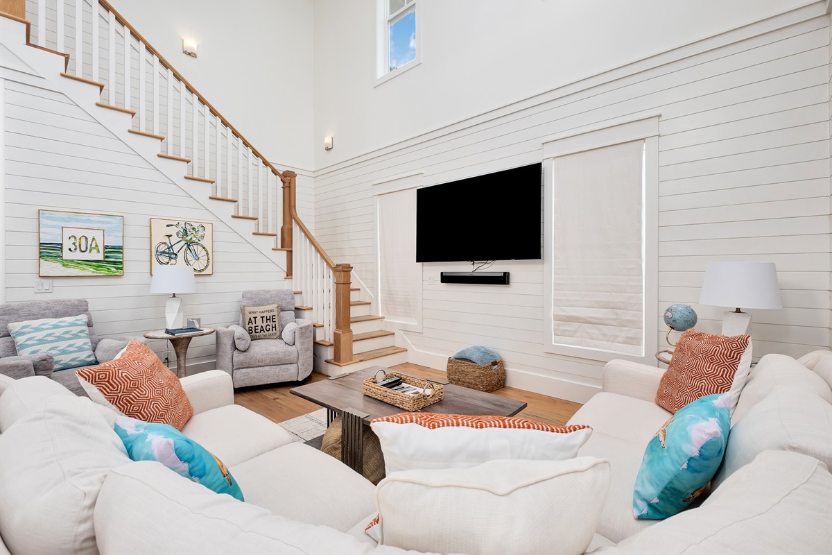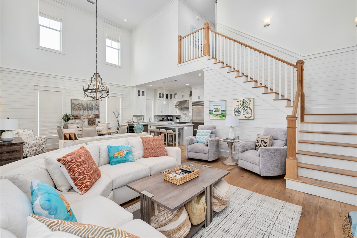 Living Space: Open-concept with vaulted ceilings, abundant natural light, two comfortable sofas, several chairs, and a TV