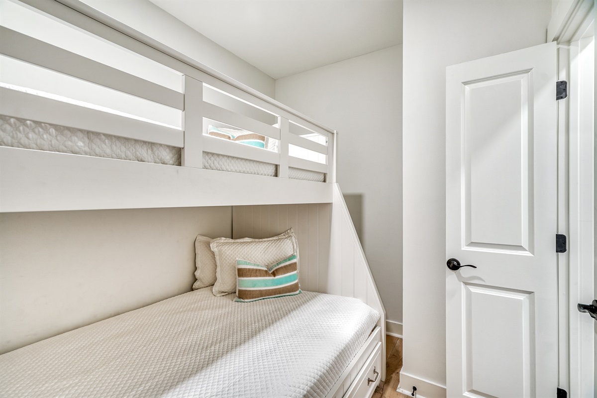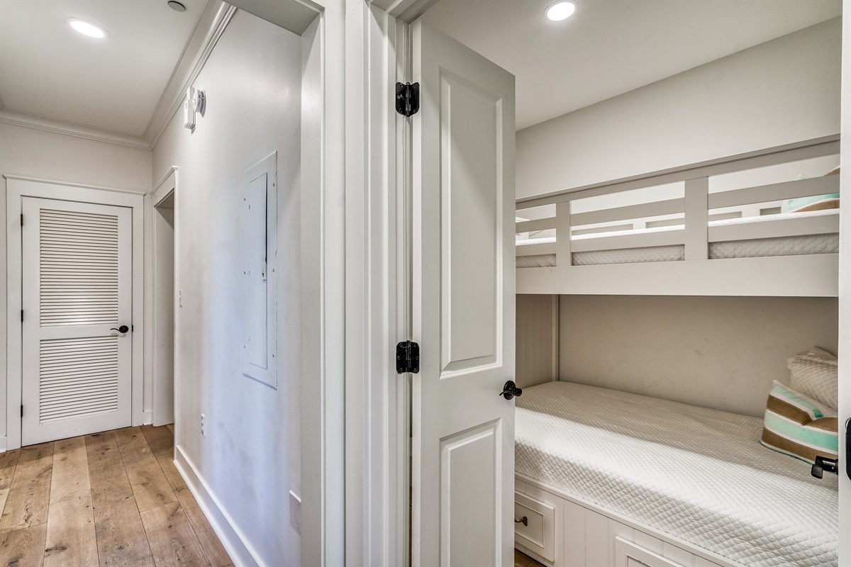 Bunk Nook: Sleeps 3 in a Twin over Full Bunk with under-bed storage, privacy doors, no TV, and access to the shared full bath.