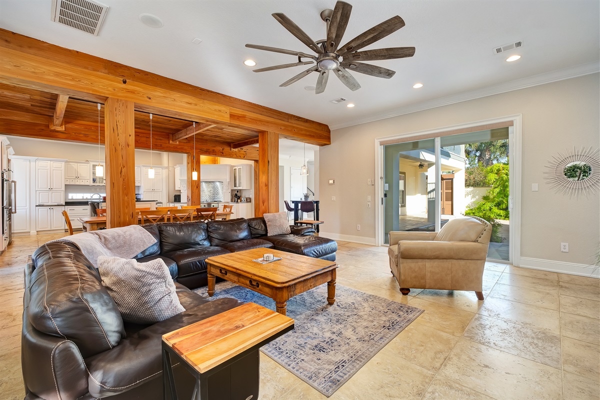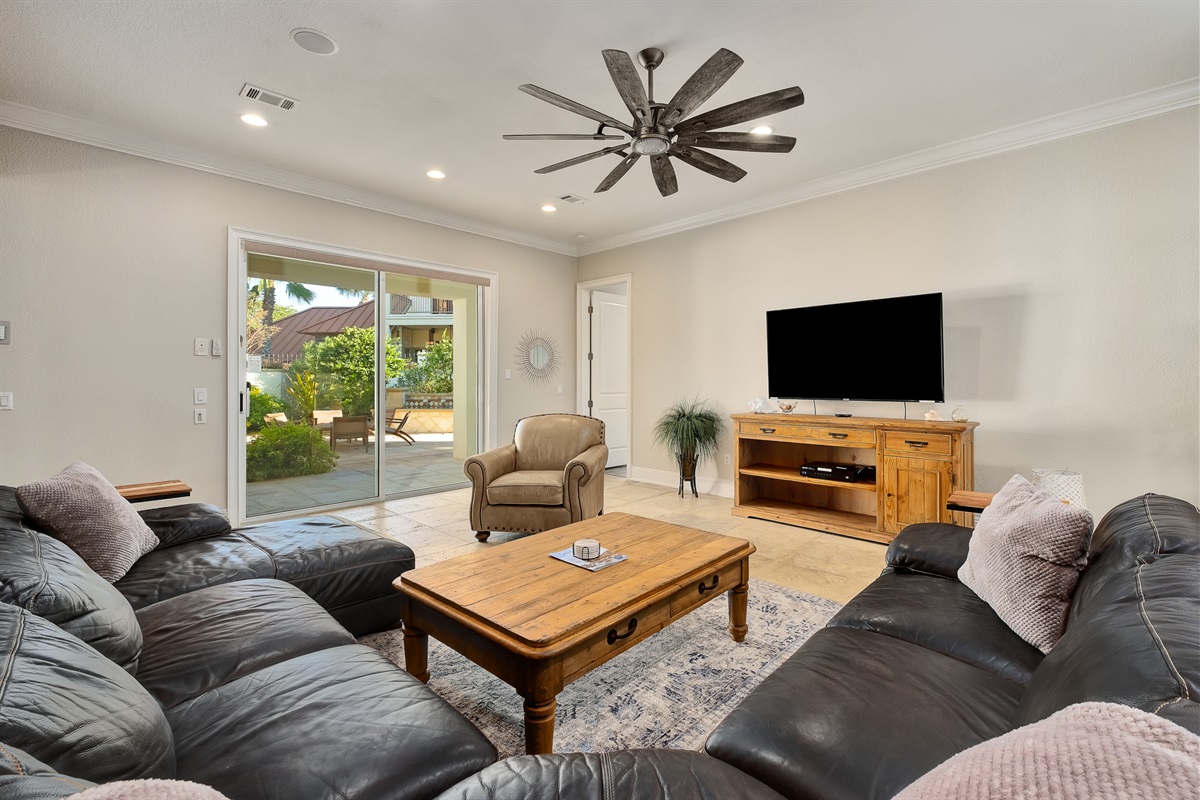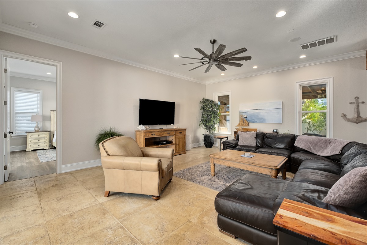 – Living Room: Adorned with a leather sectional and flat-screen TV, this space is perfect for relaxation.
