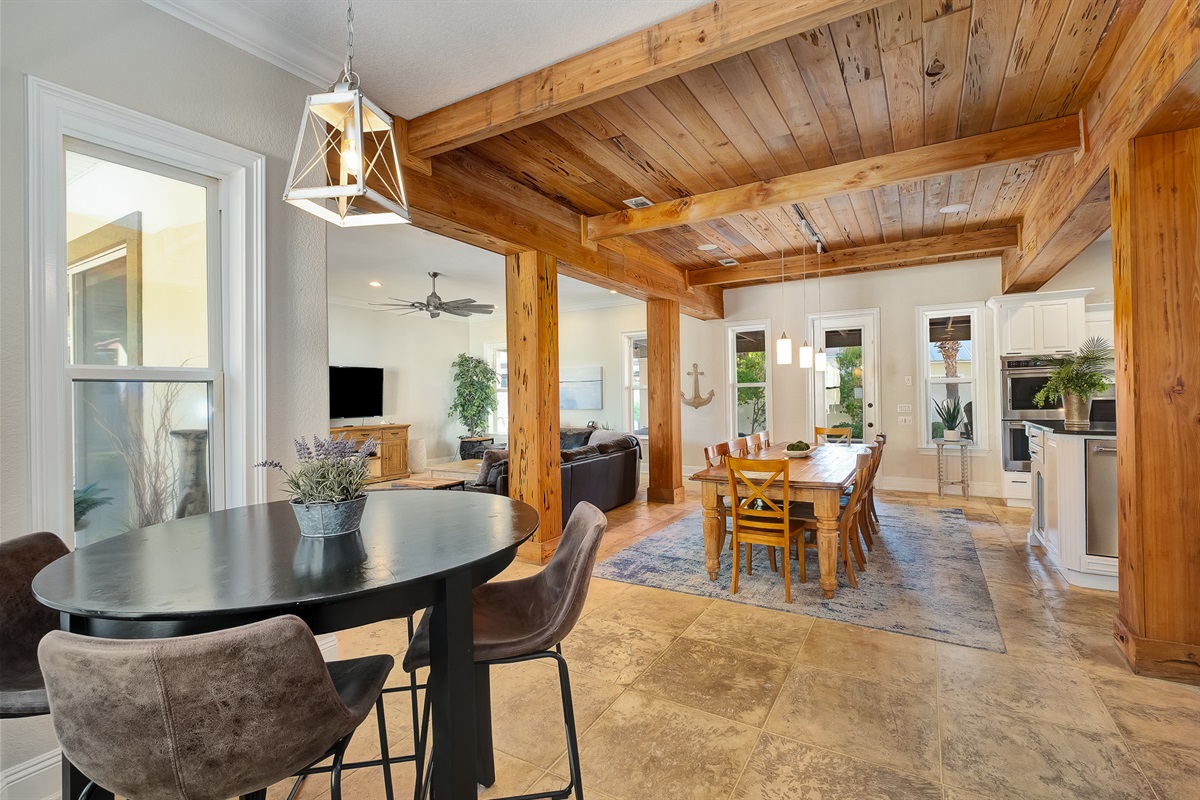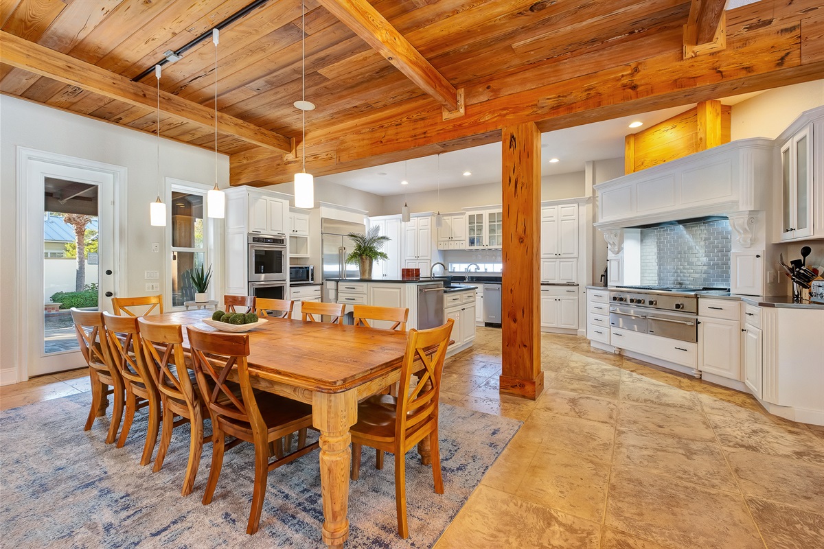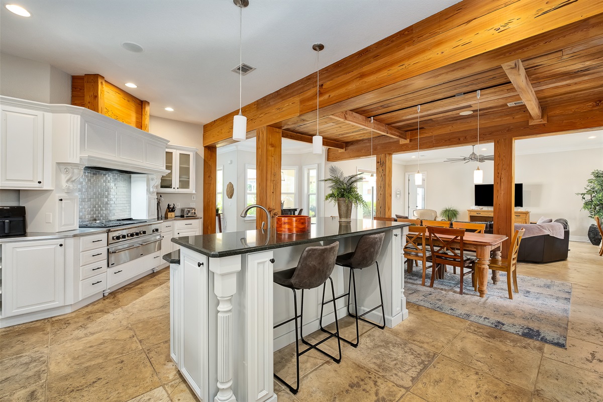 – Kitchen & Dining Area: The state-of-the-art gourmet kitchen features a spacious island, stunning tile flooring, and stainless steel appliances. The adjacent dining room, with an elegant wooden table, fosters conversation and camaraderie.