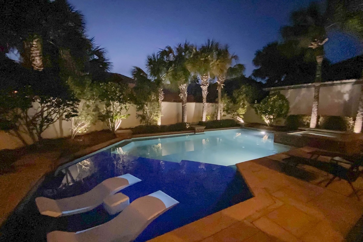– Pool Area: A serene oasis with abundant patio seating, a private natural gas grill, and a spacious pool featuring a tanning ledge and floating seating. Landscape lighting provides a captivating ambiance for nighttime enjoyment.