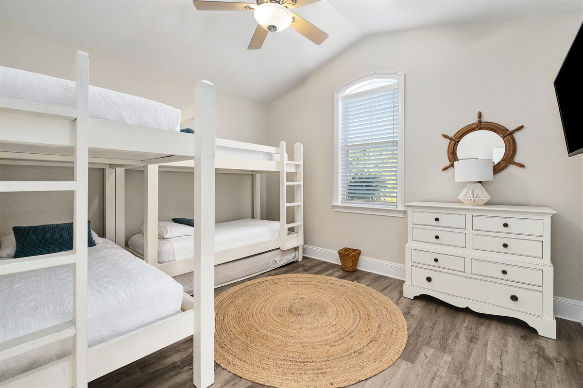 – Queen bedroom and bunk room (twin over twin bunks) share a bathroom with private entry. The bunk room includes built-in USB charging ports.