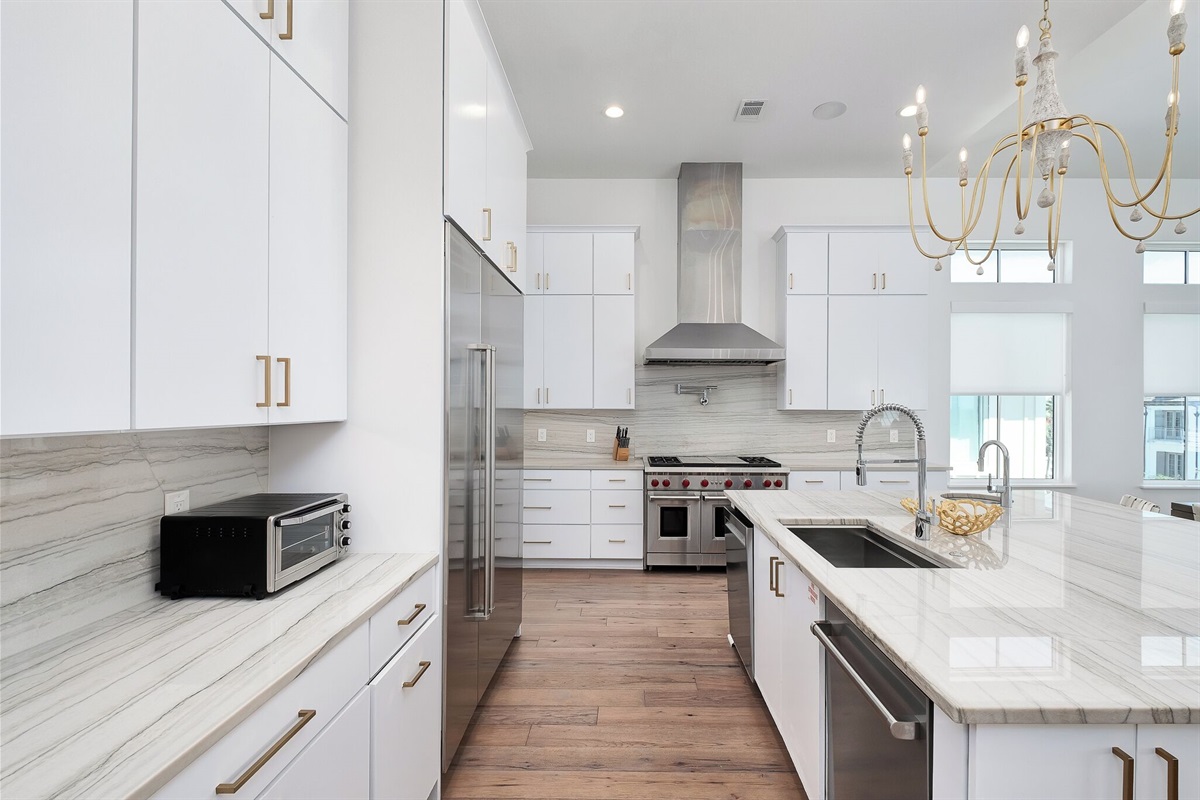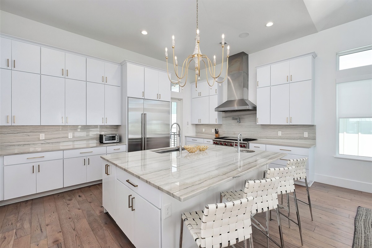Galley style kitchen with Sub-Zero fridge, Wolf natural gas range/oven, huge kitchen island and tons of storage.