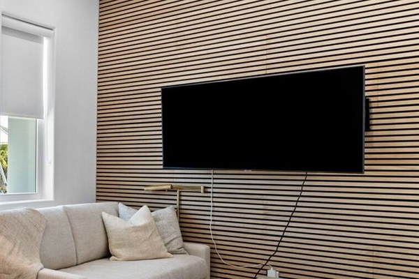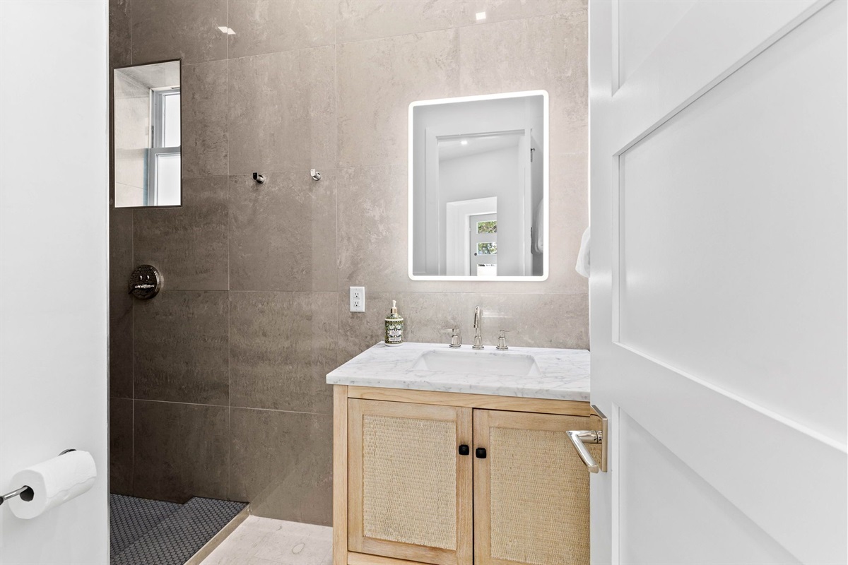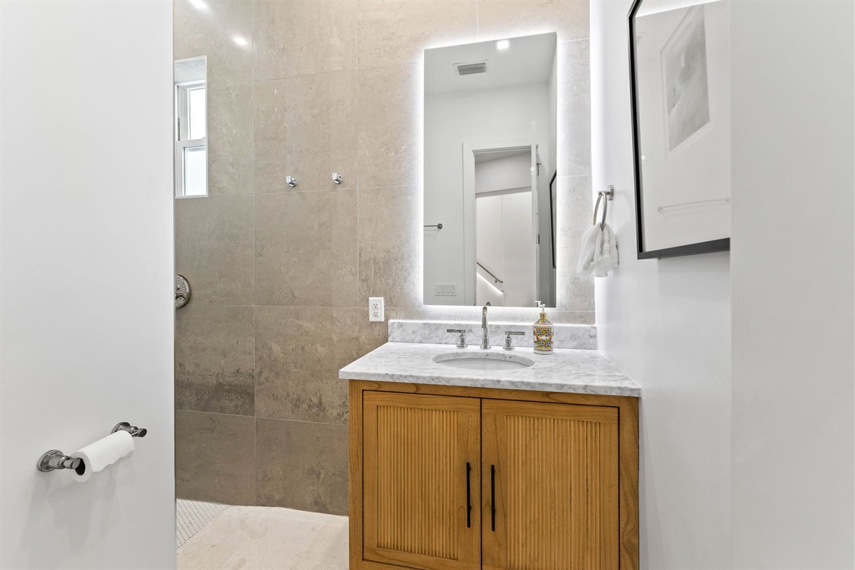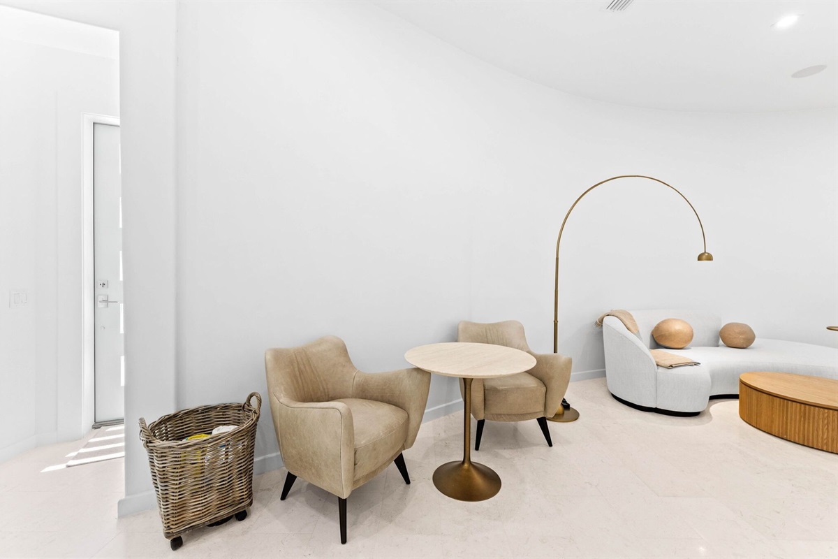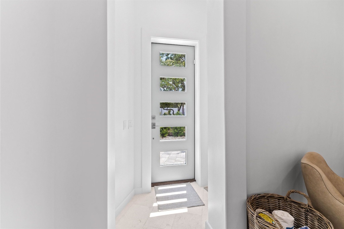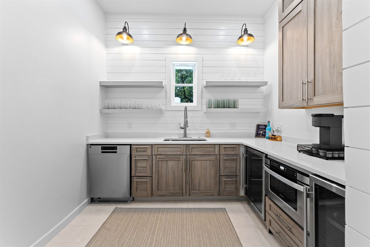 Entryway: Guests enter the home from the side just off the driveway. The first floor features a large lounge area, prep kitchen with wet bar, wine cooler, microwave, and a mini fridge. Guests can access the back yard hardscape area where there is an outdoor seating area, outdoor shower, and walkway to the neighboring beach access which is under a minute away.