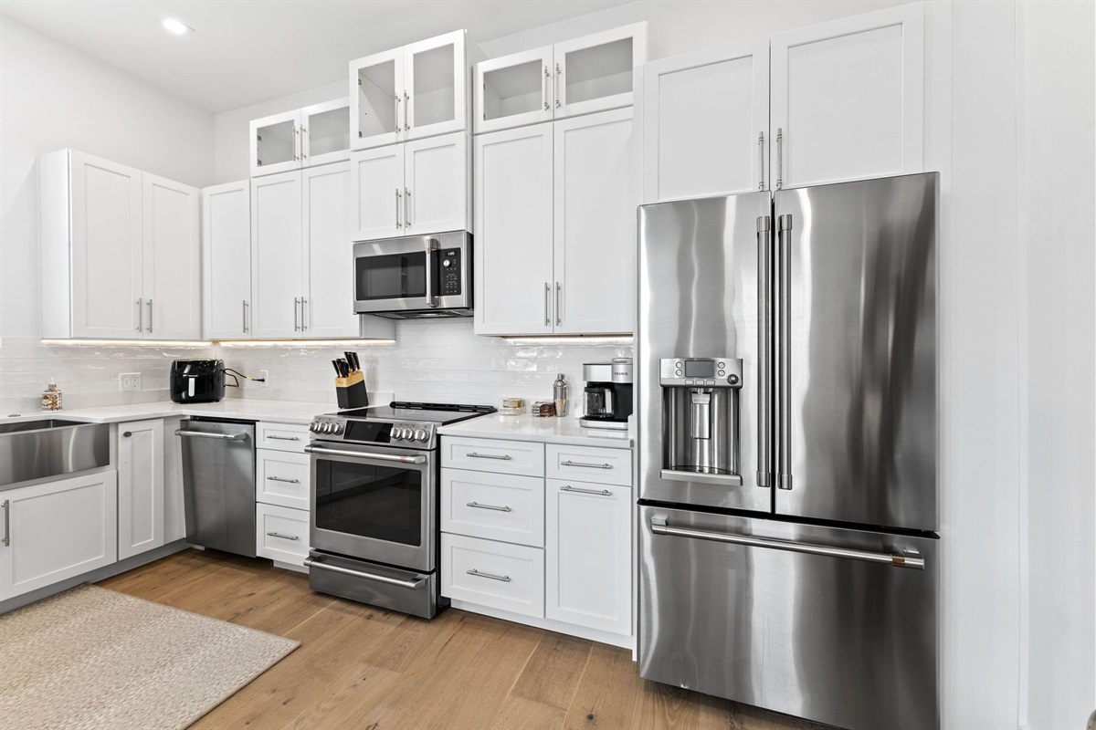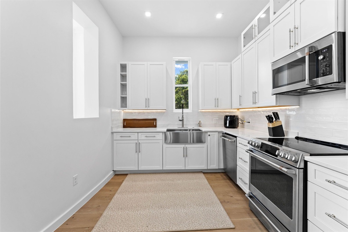 Kitchen: Equipped with standard appliances, Keurig, flatware, cutlery, and basic cookware.