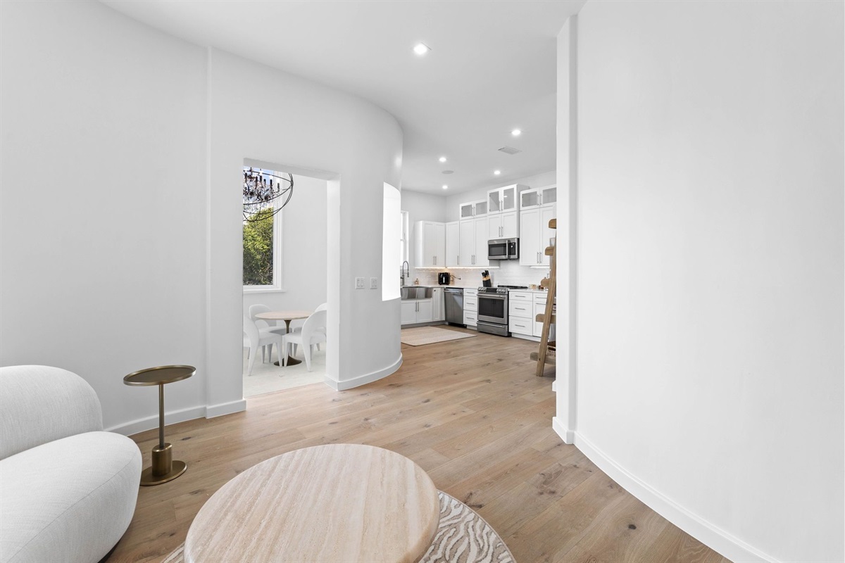 There is a formal dining area just off the kitchen with seating for 8. This area is private, but open an inviting at the same time.