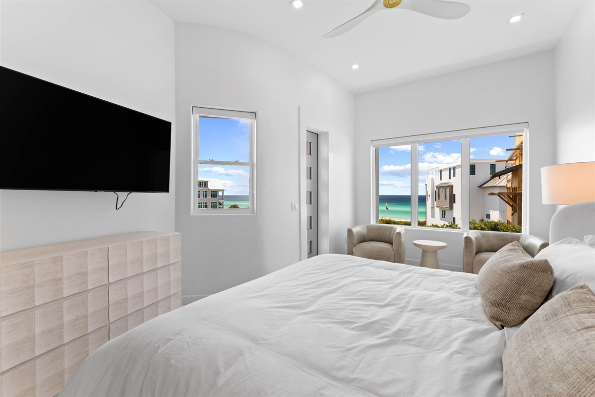 Bedroom #4 – Master Bedroom: The Master Bedroom is located on the second floor and features a large balcony with private access off the Master Bedroom, expansive views of the Gulf, plenty of large bay windows with Gulf views, King bed, en-suite bathroom with dual sinks, large soaking tub, and a stand-alone shower.
